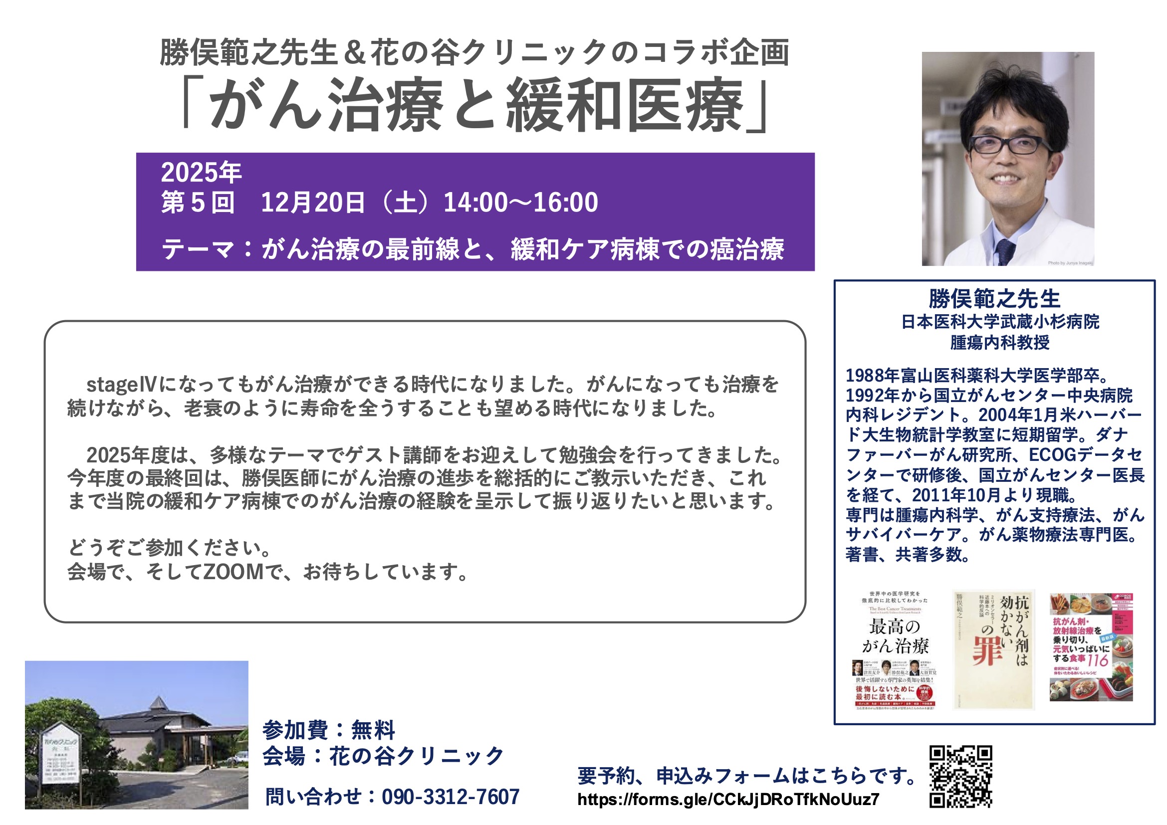 2025年度は、多様なテーマでゲスト講師をお迎えして勉強会を行ってきました。今年度の最終回は、勝俣医師にがん治療の進歩を総括的にご教示いただき、これまで当院の緩和ケア病棟でのがん治療の経験を呈示して振り返りたいと思います。